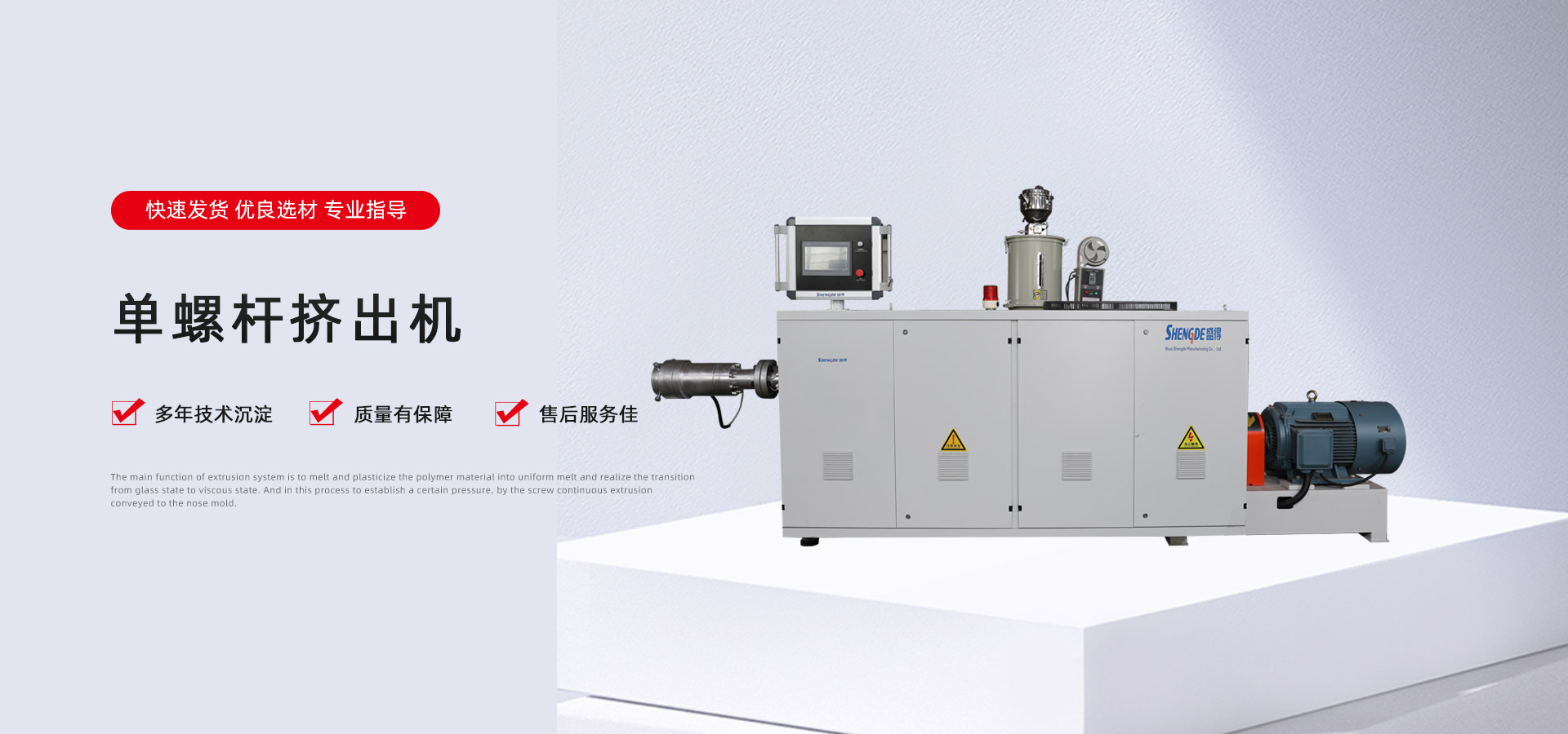 无锡盛得环境设备制造有限公司坐落于景色秀丽、经济发达的江苏无锡,毗临上海、苏州,拥有便利的运输优势。公司专注于生产塑料单螺杆挤出机20余年,致力于为客户带来质量过硬、技术领先的塑料管材生产设备。